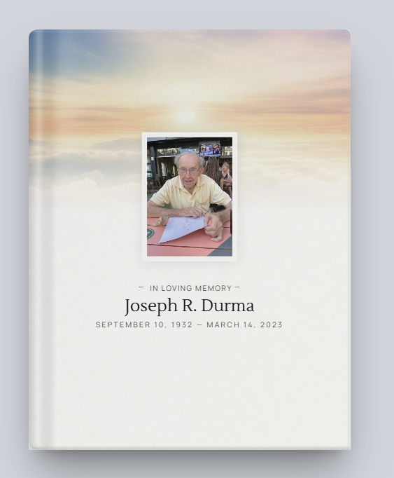 He is survived by his loving children, his son Joseph Durma; his daughter Patricia Miller and her husband Tim; his son James Durma and his wife, Elise Kim. His son William Durma, his wife Charlotte, and sister Dorothy Romer.