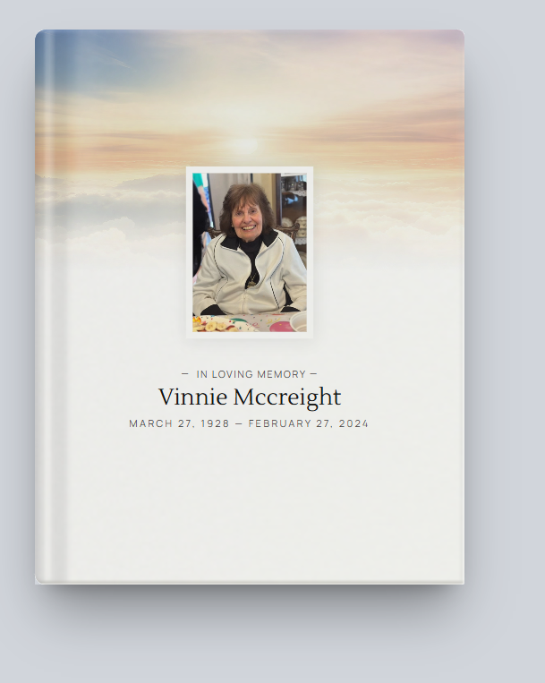 Vinnie McCreight passed away peacefully at home on February 27, 2024. She was born on March 27, 1928 and was predeceased by her parents, Antonio and Maria Caputo; siblings, Nancy (Danny) Cavaluzzi and John (Ann) Caputo and her only son William McCreight (Nancy Lavelle) with whom she is now eternally reunited. She is survived by her daughter, Dorothy (Scott Tiernan; grandchildren Eric, Danielle and Jessica Tiernan and great-grandchildren Dominic and Brandon Dillon and Marissa and Jaxon Tiernan; very close nieces and nephews Toni, Christopher and Kaiya Dunne, Daniel and Joseph Cavaluzzi, Barbara (Richard) Sehring and Jonathan (Georgia) Caputo.